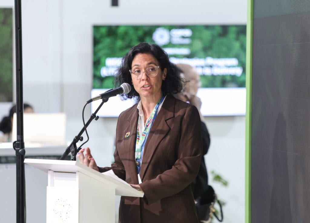 Letícia Guimarães líder global de Mercado de Carbono do Programa das Nações Unidas para o Desenvolvimento (PNUD), mediou o painel sobre os programas de distribuição de recursos originados por serviços ambientais dos estados da Amazônia.